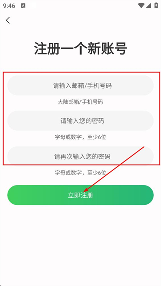 4、在注册页面,填写手机号码、密码、确认密码后,点击立即注册。