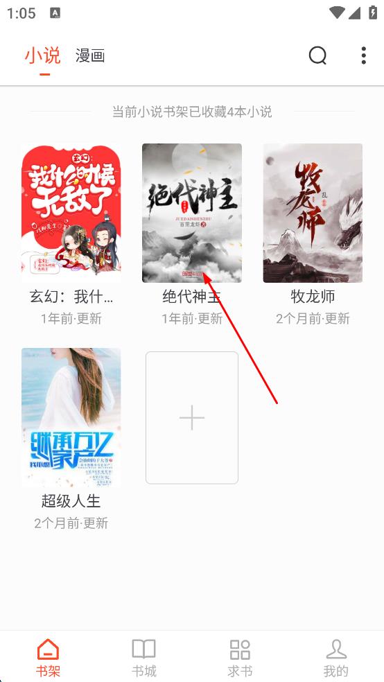 3、进入追书大全主界面,界面有“小说”“漫画”等分类,还有书架展示已收藏小说,在书架中找到想要阅读的小说,点击该小说封面。