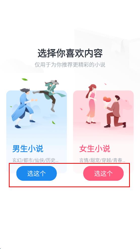 2、进入选择喜欢内容界面,界面有男生小说和女生小说两个类别,根据喜好点击“男生小说”或“女生小说”下方的“选这个”按钮。