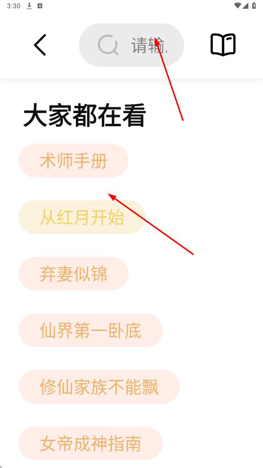 2、搜索界面展示大家都在看推荐标签,点击术师手册标签浅粉色背景,黑色文字,触发搜索。