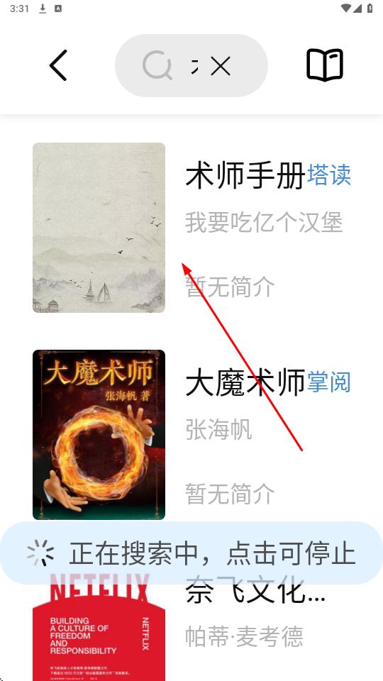 3、搜索结果页加载完成后,选择《术师手册》条目左侧显书籍封面,右侧标注塔读平台、作者我要吃亿个汉堡、暂无简介,点击进入书籍详情页。