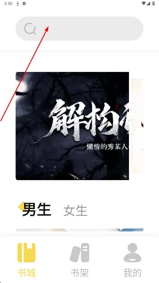 1、在APP底部导航栏点击书城图标黄色书本样式,进入书城页面,点击顶部搜索栏放大镜图标右侧空白区,跳转至搜索界面。