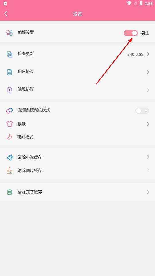 3、在设置界面中,点击偏好设置右侧的开关按钮,可选择男生或女生偏好,还能在该界面进行检查更新、管理缓存、切换夜间模式、更换皮肤等操作。