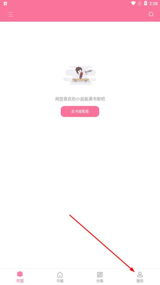 1、打开阅民小说APP,进入书架页面,点击底部导航栏最右侧的我的图标,进入个人中心页面。