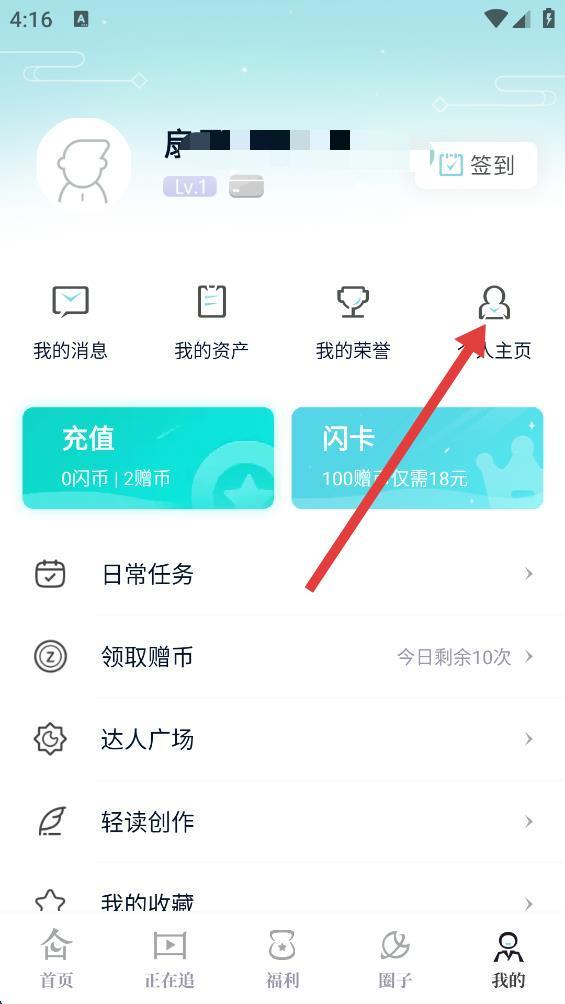 1、在个人页面点击上方的,个人主页选项。