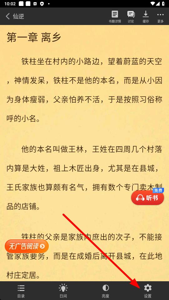 1、在追书神器app阅读界面,点击屏幕下方的设置按钮。