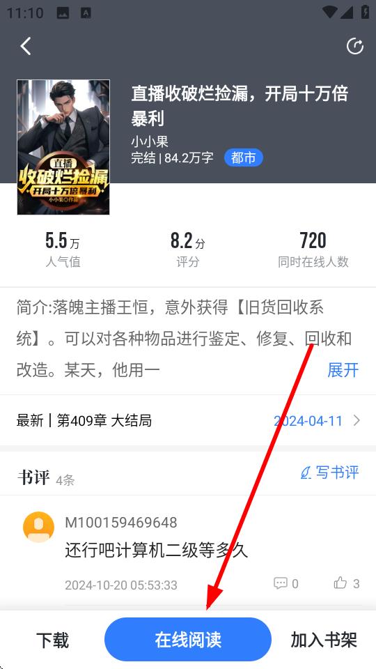2、进入小说详情页后,点击下方蓝色的在线阅读按钮,进入小说阅读界面。