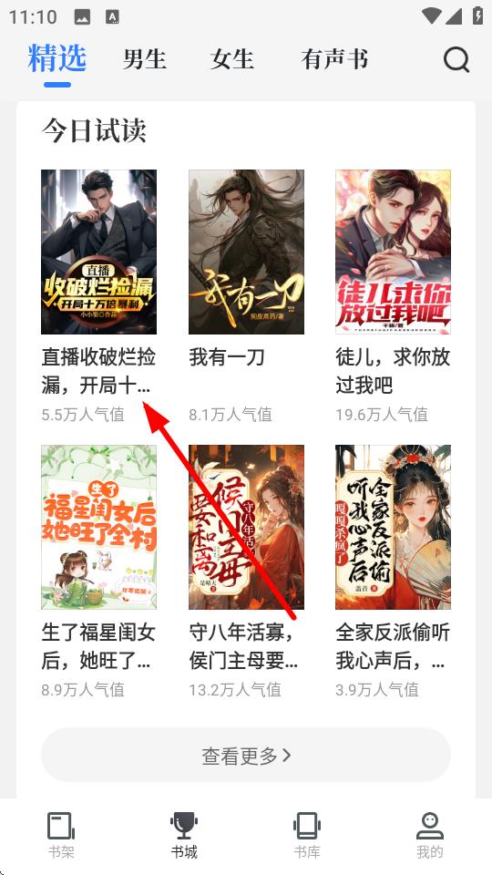 1、打开中文书城APP,在精选页面的今日试读板块中,点击小说直播收破烂捡漏,开局十万倍暴利。