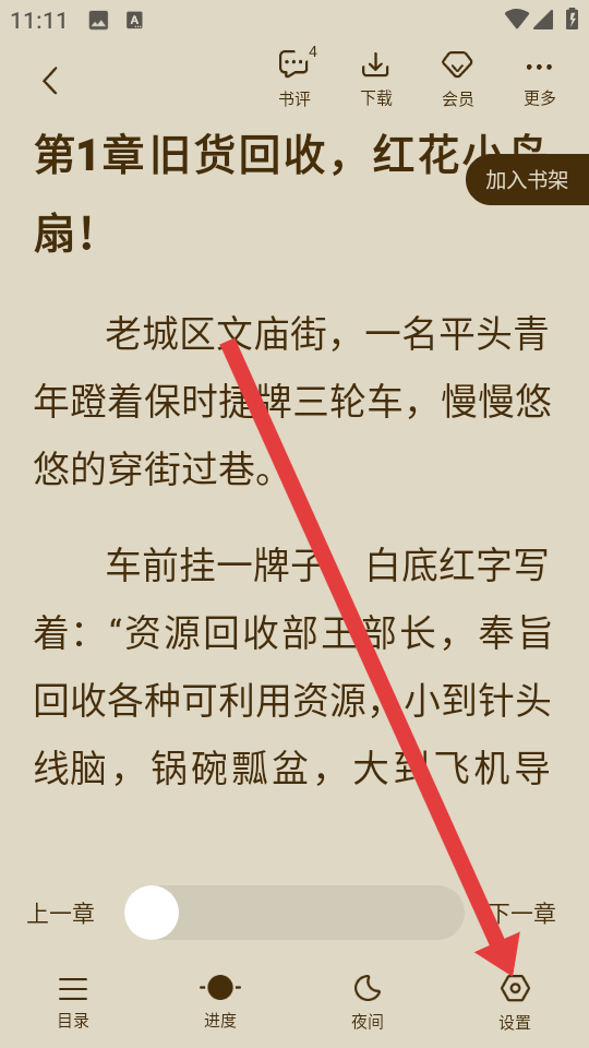 3、在阅读界面中,点击底部导航栏最右侧的设置选项。