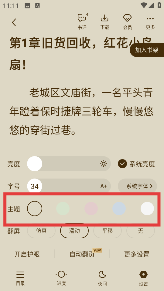 4、在弹出的设置窗口里,找到主题一栏,点击选择喜欢的颜色选项,即可更改阅读背景颜色。