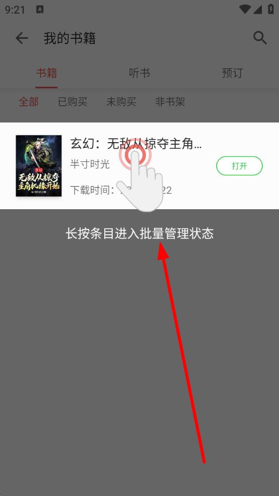 2、在个人界面里找到我的书籍并点击进入,长按书籍条目进入批量管理状态。