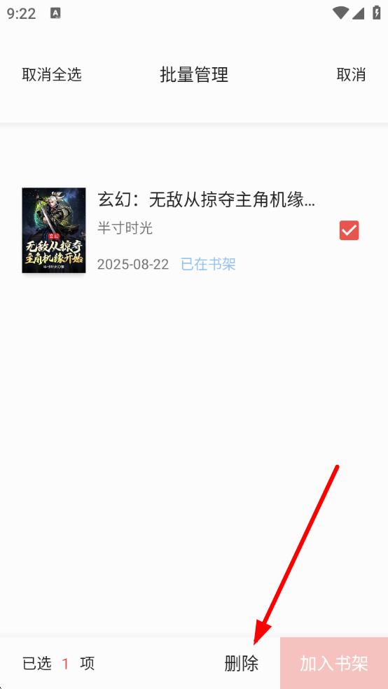 3、在批量管理界面勾选要删除阅读记录的书籍,点击下方删除按钮完成操作。