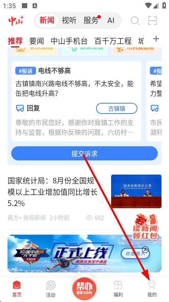 1、打开中山日报app,点击底部导航栏最右侧的我的进入个人页面。
