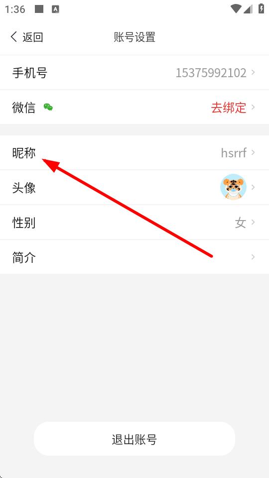 3、在账号设置页面里,找到并点击昵称选项,进入修改昵称页面。