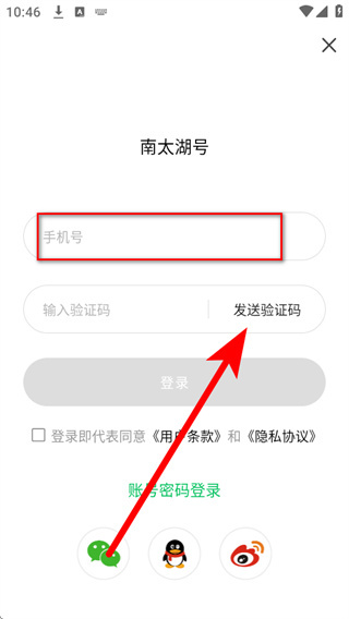 3、在登录界面的手机号栏填写对应的手机号码,点击发送验证码。