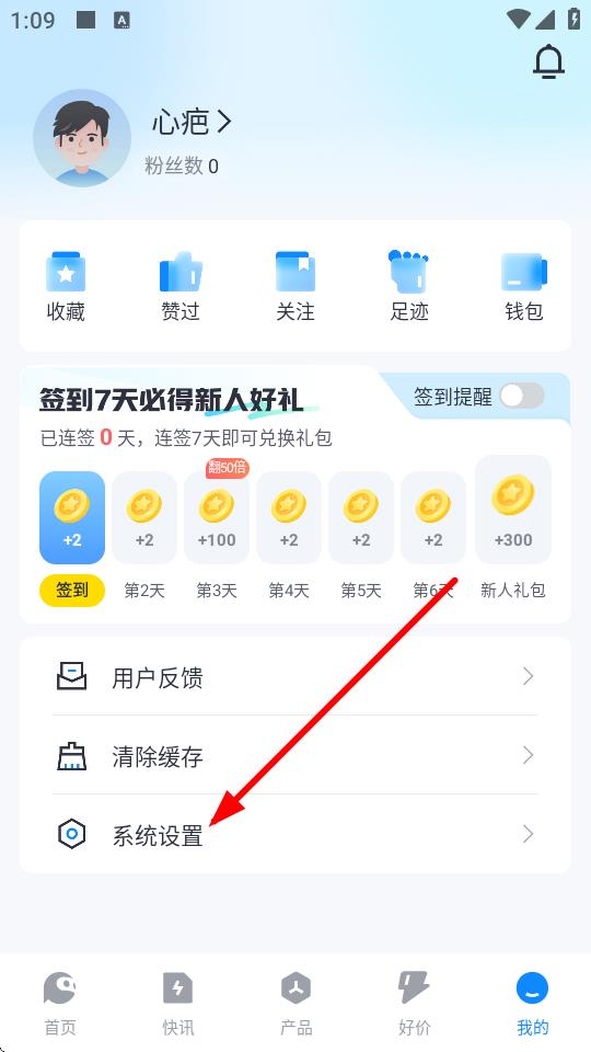 2、在个人页面中,向下滑动找到并点击系统设置选项进入设置界面。