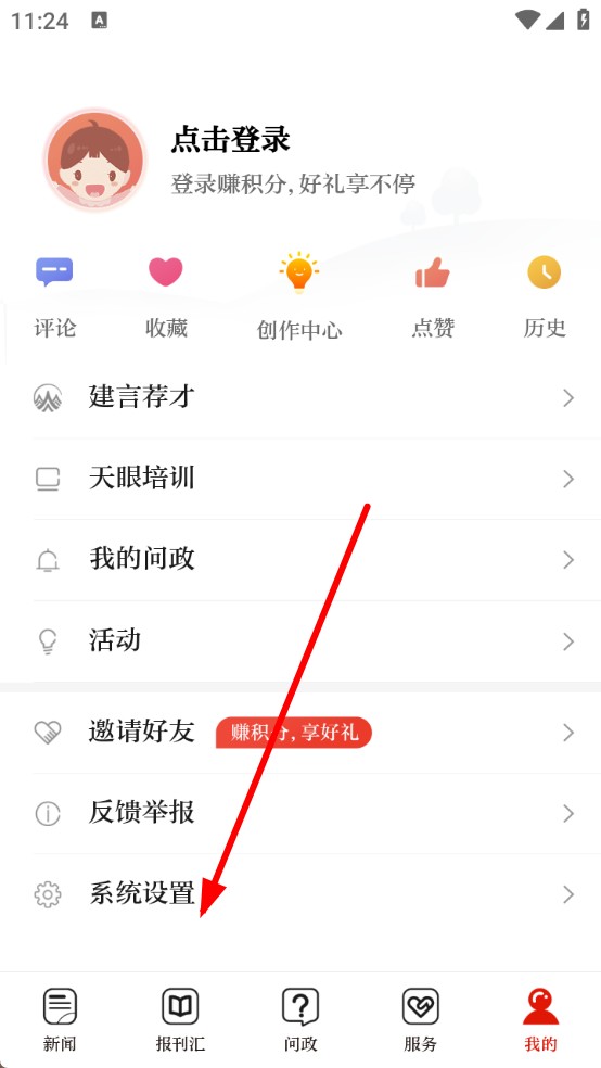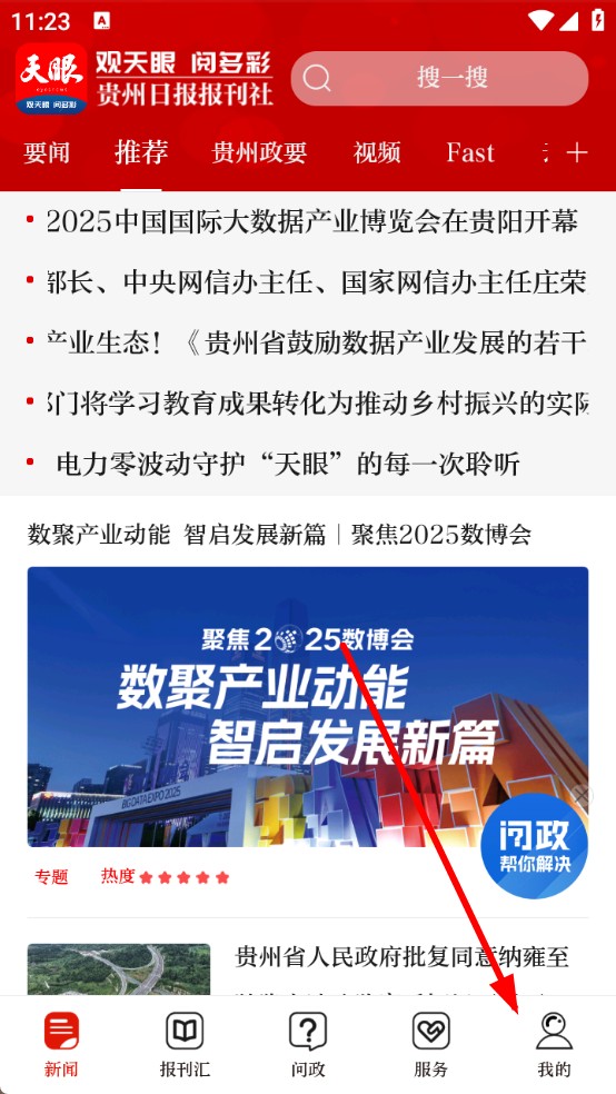1、打开天眼新闻APP,点击底部导航栏中的我的,进入个人页面。