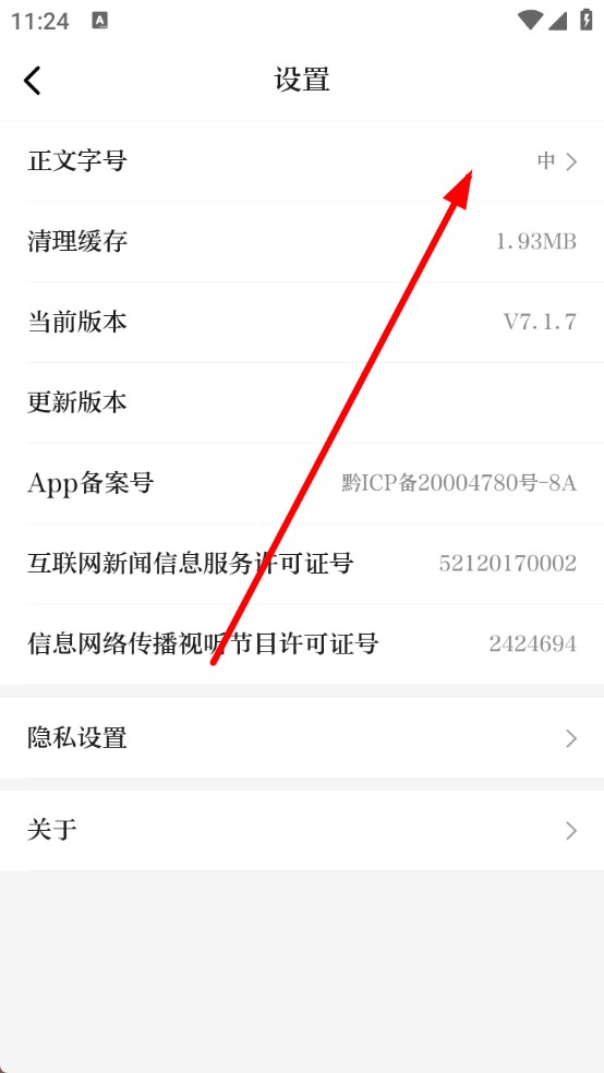 3、进入设置页面后,点击正文字号选项。