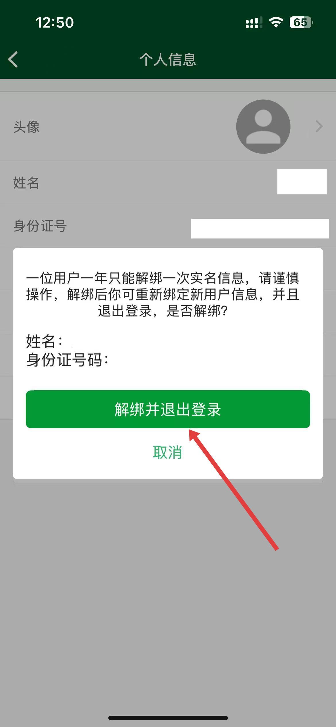 4、在弹出的提示框中,点击解绑并退出登录,完成实名解绑操作。