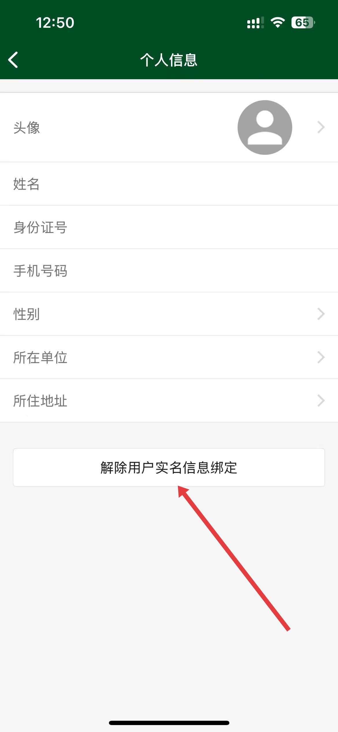 3、在个人信息界面,点击解除用户实名信息绑定按钮。