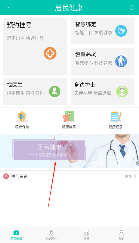1、打开居民健康APP进入居民健康页面,可使用预约挂号功能快速挂号,点击智慧绑定等服务,还能通过找医生身边护士入口,获取精准医疗服务,管理健康档案记录。