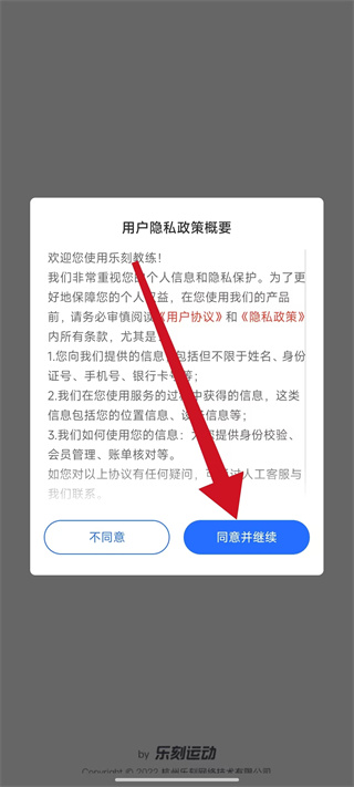 1、打开乐刻教练,在弹窗中点击同意并继续,进入应用首页。