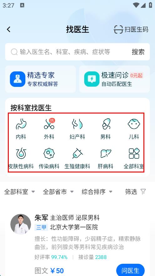 3、进入该科室的医生列表页面,选择想要咨询的医生,点击医生右侧的问医生按钮,