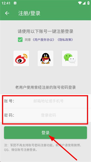 3、在注册/登录页面,输入账号和密码后点击登录,完成登录操作。