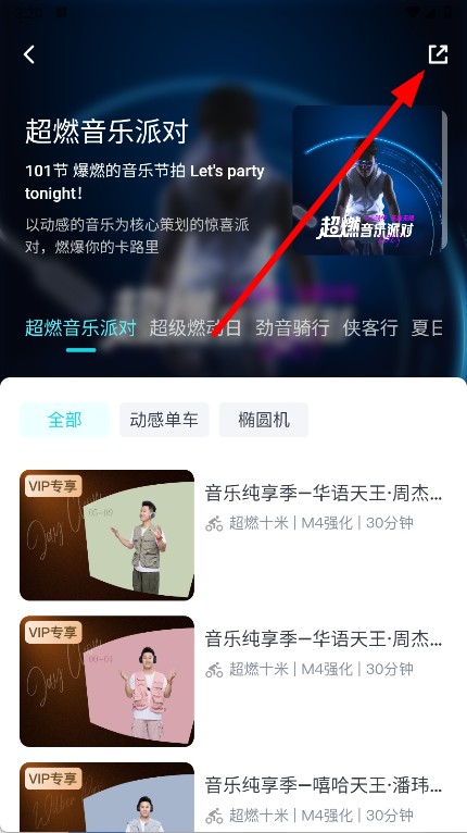 3、在超燃音乐派对课程详情页面,点击右上角的分享图标,弹出分享选项。