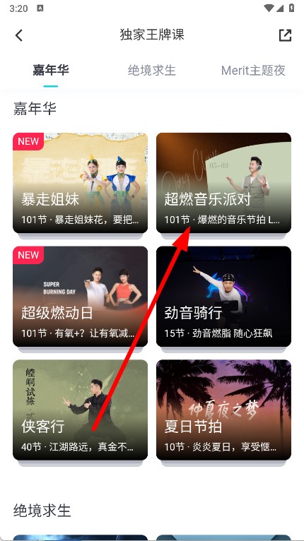 2、在独家王牌课列表页面,点击超燃音乐派对课程卡片,进入该课程的详情页面。