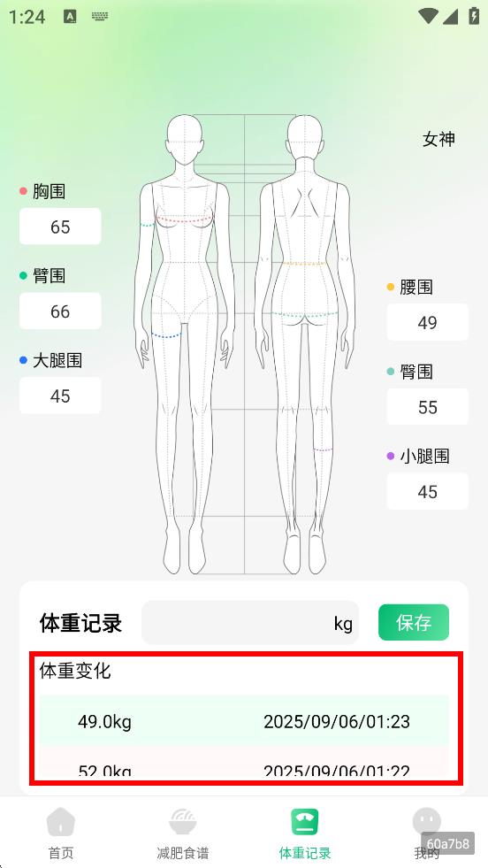 4、输入身体围度信息并保存后,可查看体重变化记录。