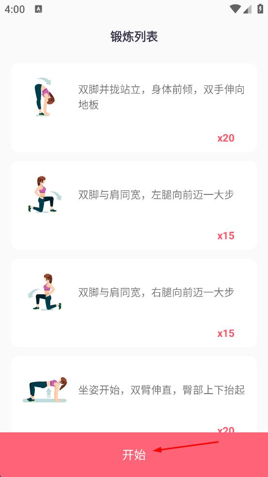 4、在锻炼列表页面查看锻炼项目,点击“开始”,即可开始第一天的运动锻炼。