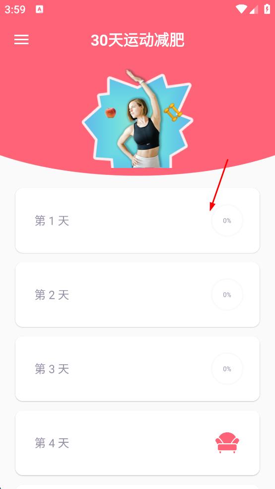 1、打开运动减肥计划APP,在首页点击第1天的按钮。