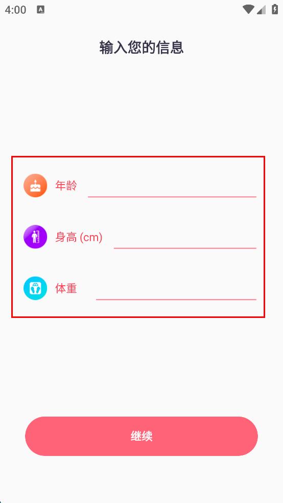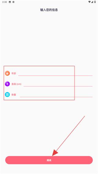 3、在输入信息页面依次输入年龄、身高、体重,点击继续,进入锻炼列表页面。