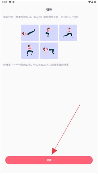 3、可根据图片提示来进行锻炼,了解后点击完成的按钮。