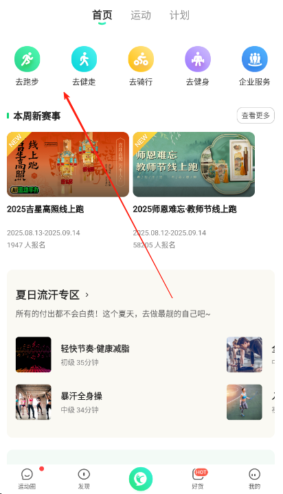 1、打开运动APP进入首页,点击去健走等功能入口,参与本周新赛事,如2025吉皇高照线上跑,查看赛事详情报名时间,点击报名参与,还能浏览夏日流汗专区课程。