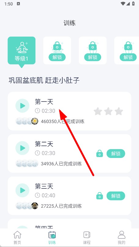 2、在训练页面,选择第一天训练内容并点击。