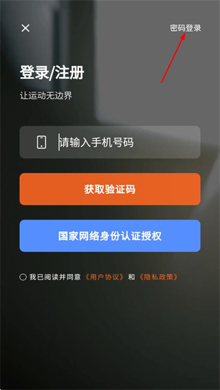 2、在登录注册页面,点击右上角密码登录选项,切换到密码登录界面。