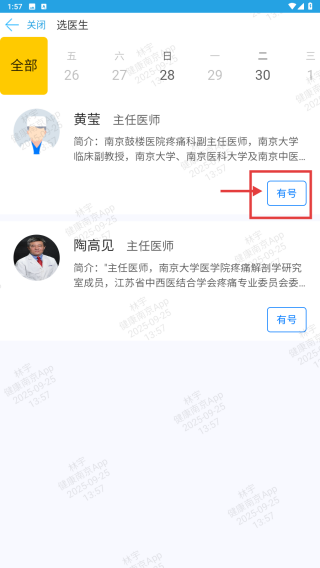 4、在医生选择页,选择有号的医生如黄莹主任医师,点击有号按钮,发起挂号操作。