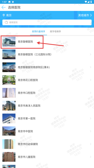 2、在医院选择页面,点击南京鼓楼医院条目,进入科室选择界面。