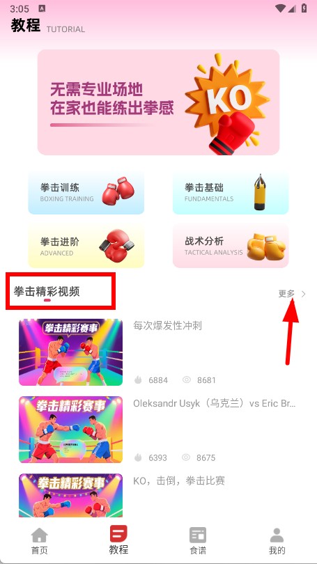 2、找到拳击精彩视频区域,点击其右侧的更多。