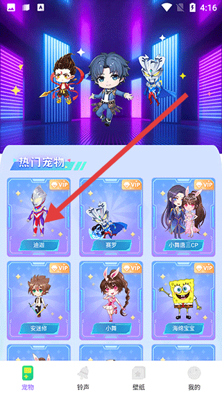 1、在应用首页,可点击热门宠物区域的宠物卡片,查看宠物详情或进行相关操作。