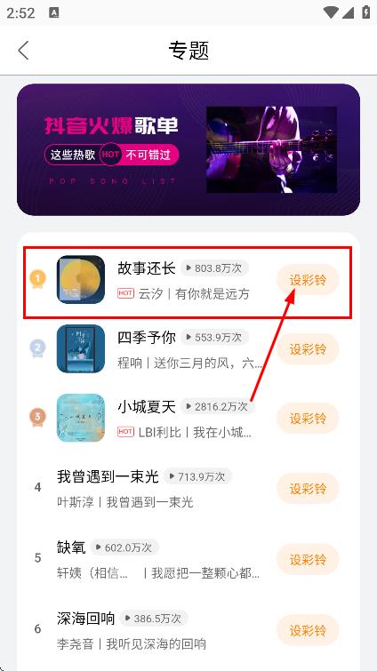 3、选择喜欢的歌曲,点击设彩铃,进入设置页面。