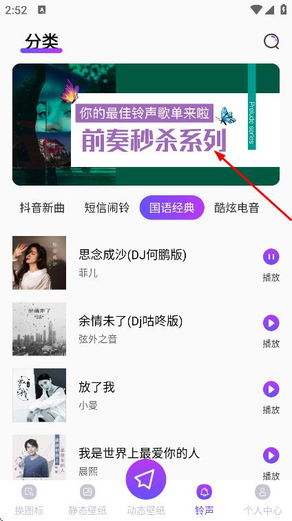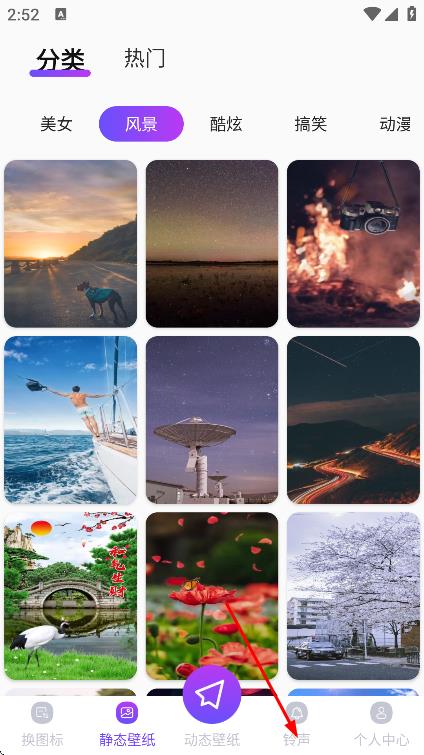 1、在静态壁纸页面,点击铃声,进入铃声页面。