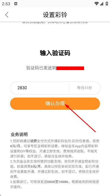 4、输入验证码后,点击确认办理,办理彩铃业务。