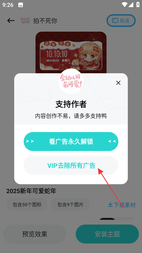 4、若弹出支持作者弹窗,可选择VIP去除所有广告来继续安装主题。