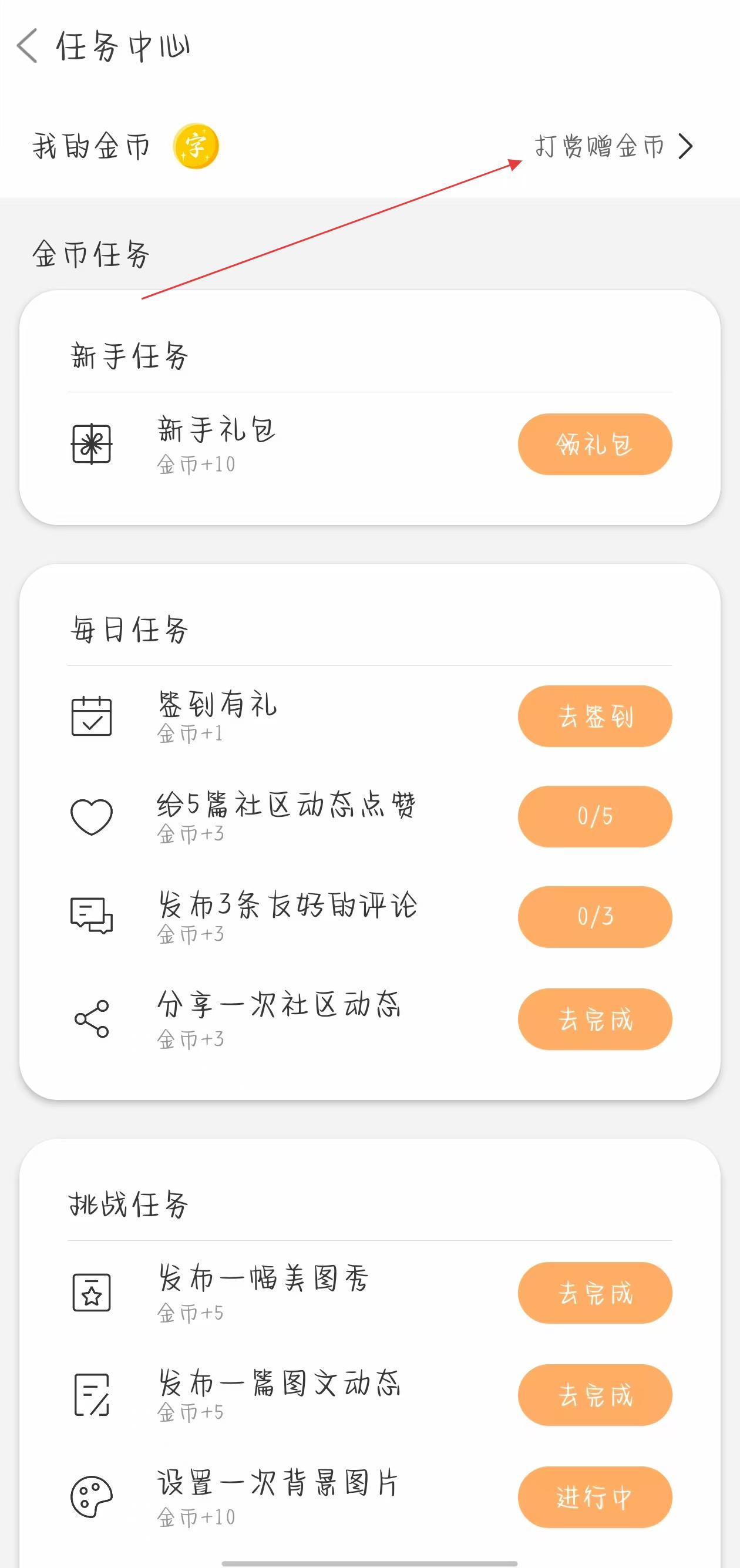 2、在任务中心页面,点击右上角打赏赠金币选项,跳转至打赏赠金币页面,页面展示多种金币套餐。