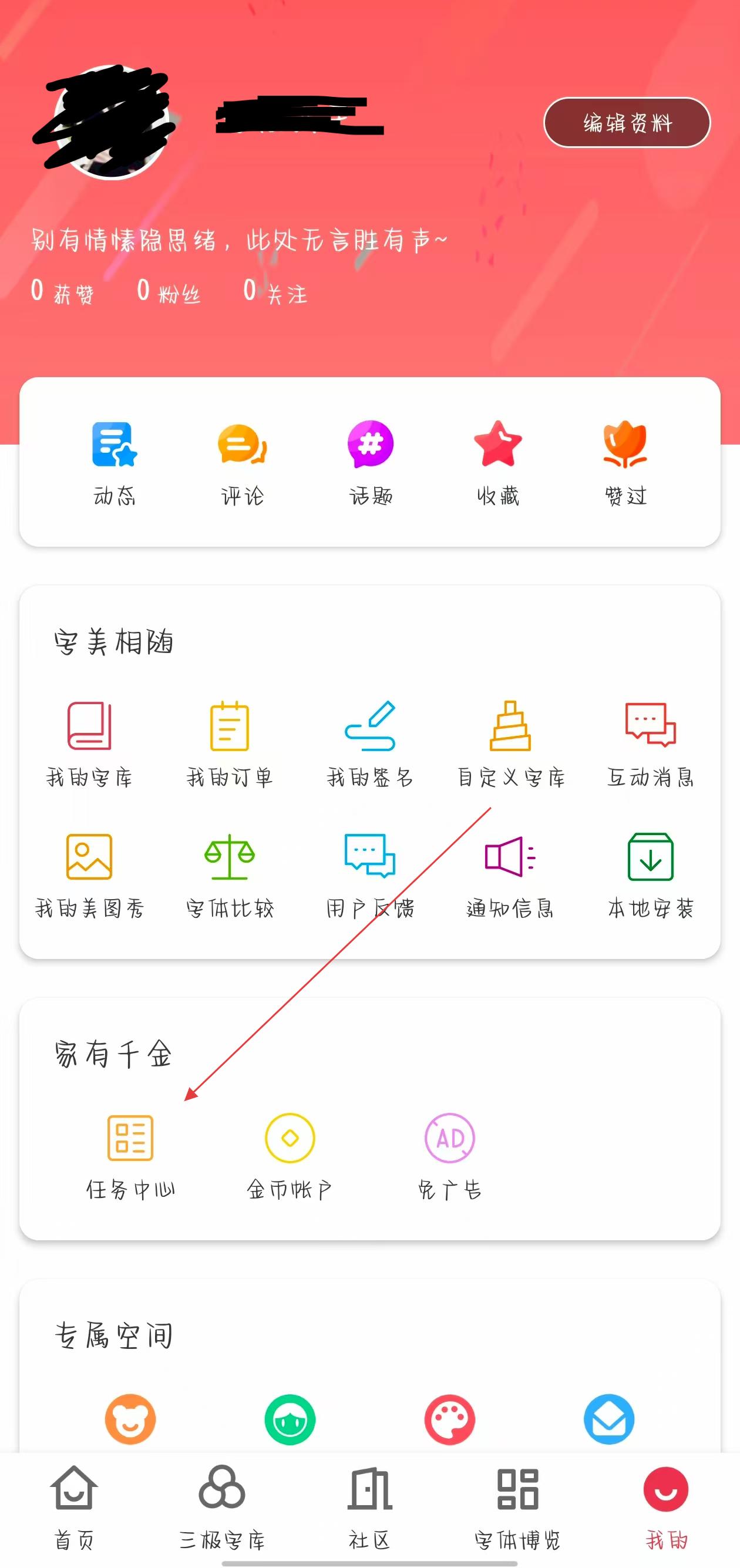 1、打开字体美化大师应用,点击底部导航栏我的选项,进入个人页面,在页面家有千金板块找到任务中心并点击进入。