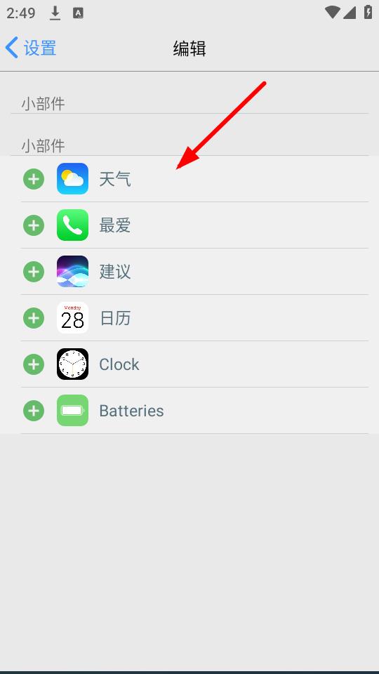 2、进入编辑页面,选择想要添加到桌面的小部件,比如点击天气小部件进行添加。