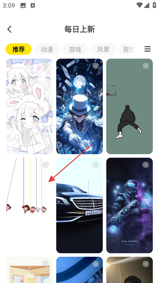 3、在每日上新的更多壁纸页面,找到心仪的壁纸,比如蜡笔小新相关壁纸,点击进入详情。
